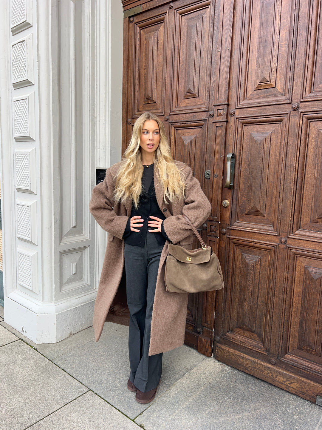 • Het model draagt de tas in de kleur koffie